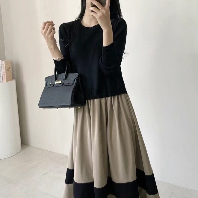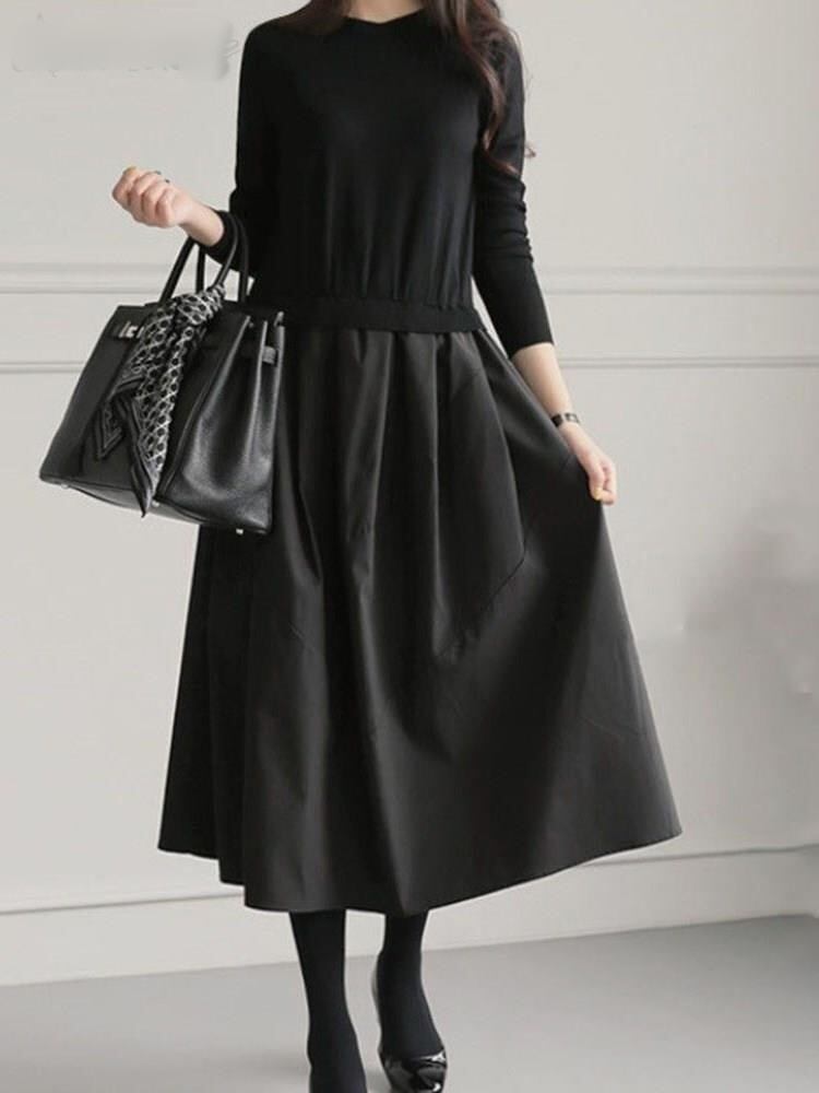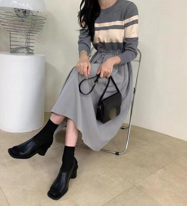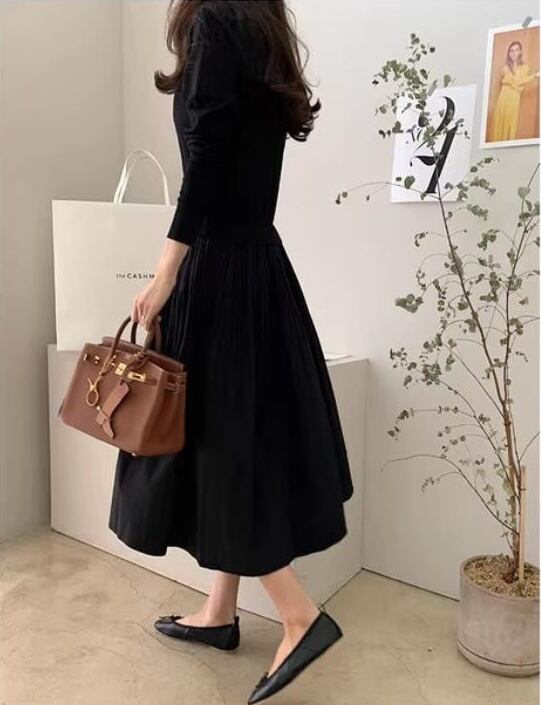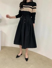 長袖とハイウエストのフレアAラインが体型を美しく見せ、こなれ感を演出します。