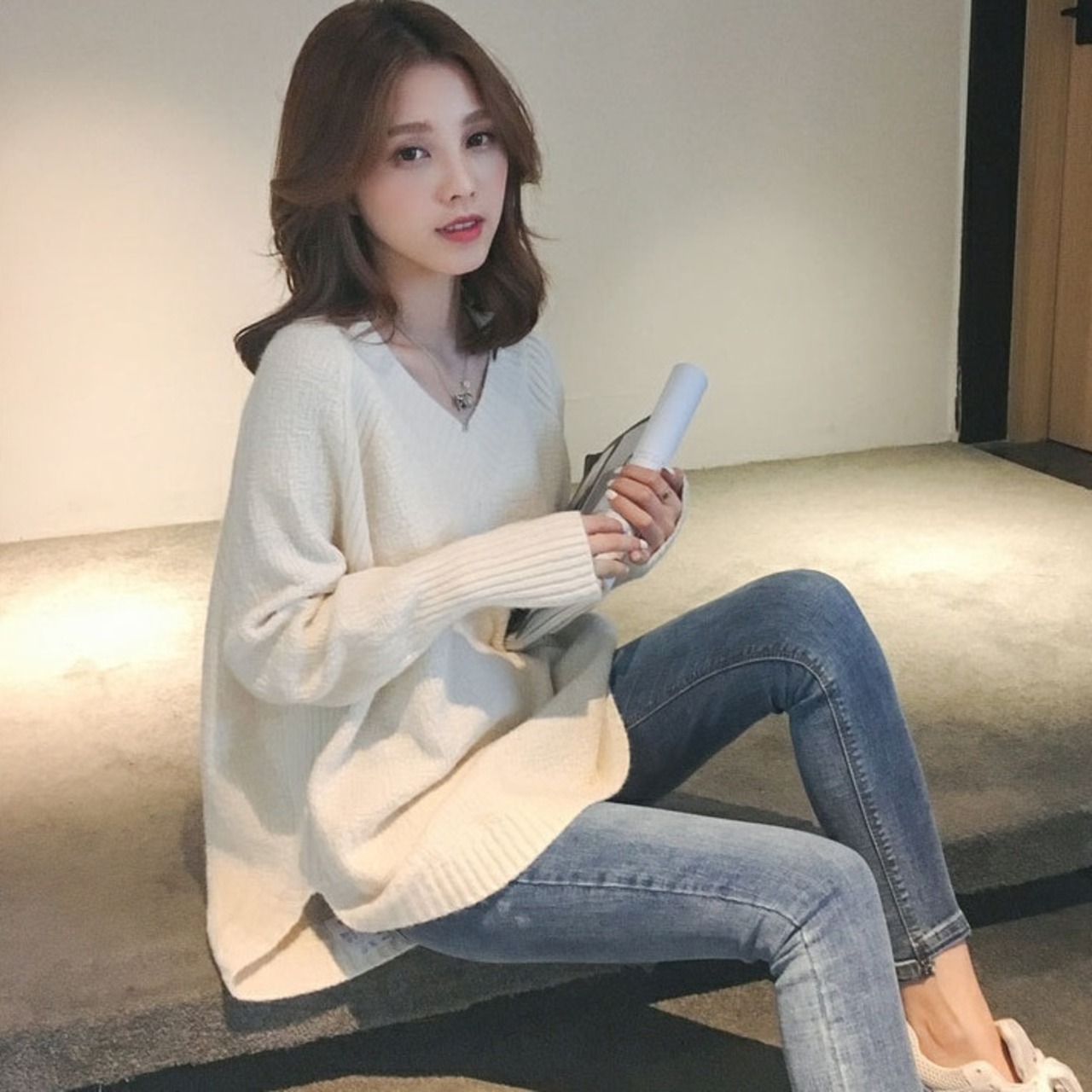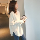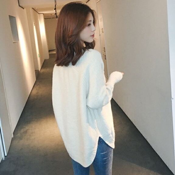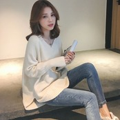 こちらのニットソーは、長袖のVネックデザインとサイドスリットが特徴。