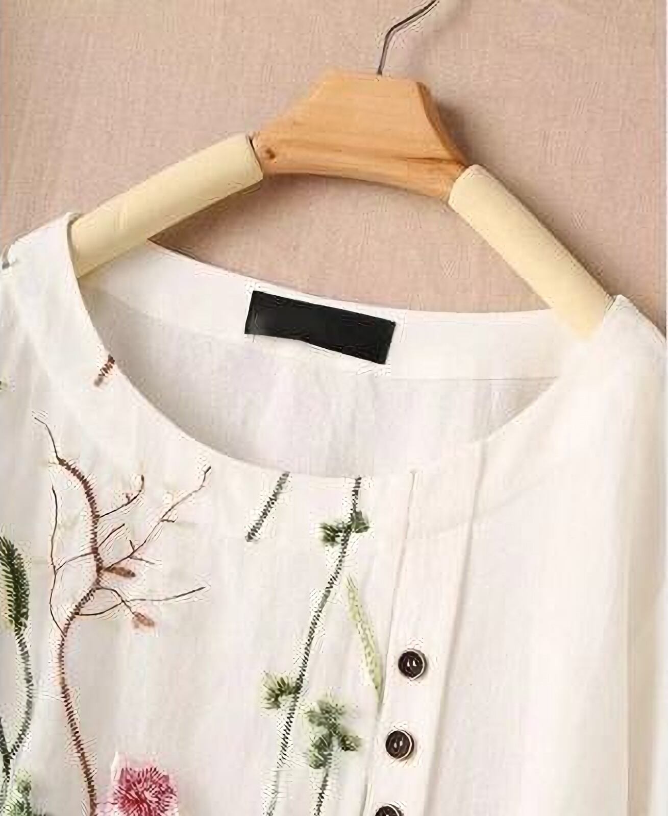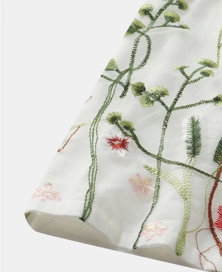 大人可愛い雰囲気と個性的なデザインが魅力の一着です。ボタニカル柄の刺繡が優雅さを演出し、主役級の存在感を誇ります。アシンメトリーなボタン配置が個性的なデザインとなっております。通気性の高いコットンリネン素材にゆったりシルエットで着心地抜群です。