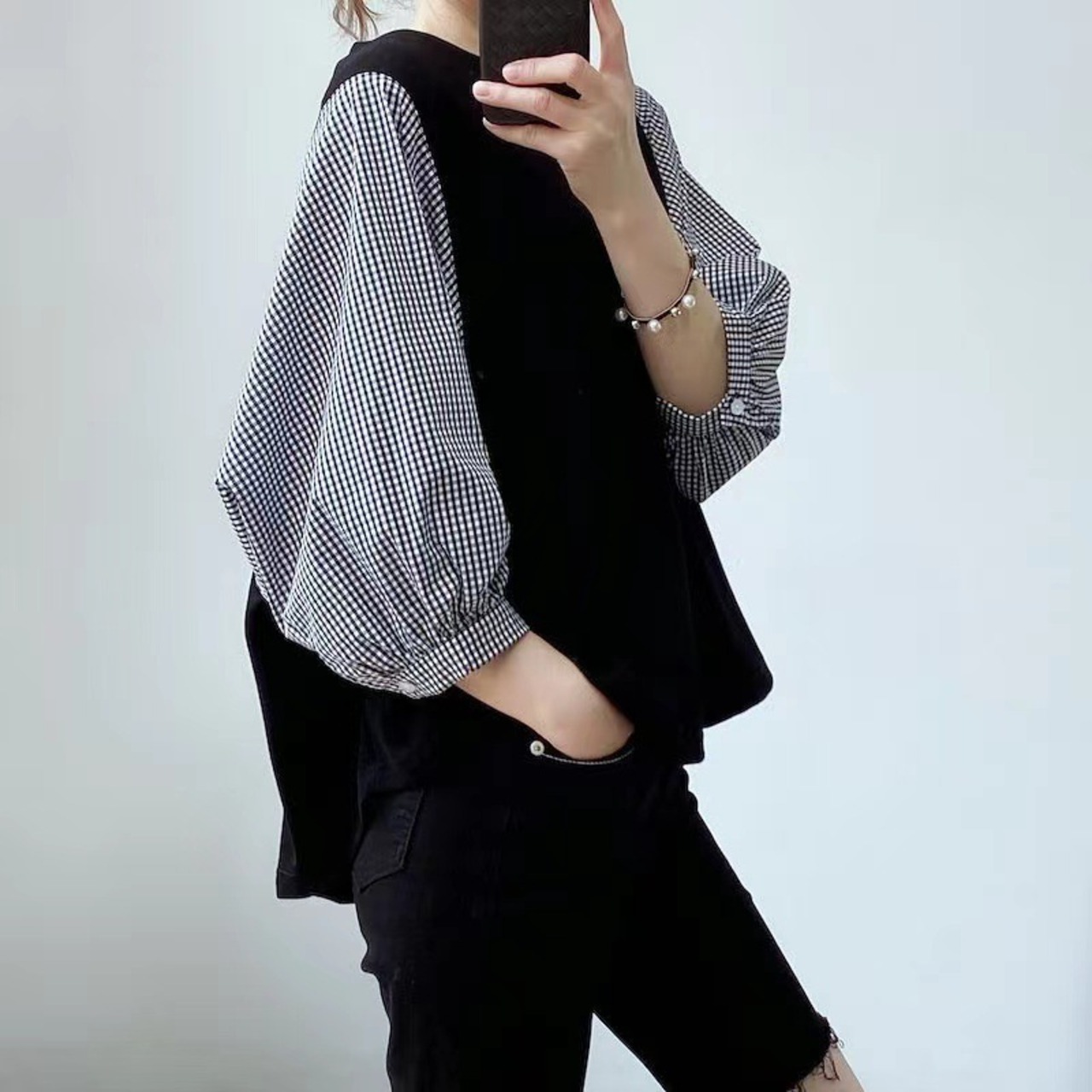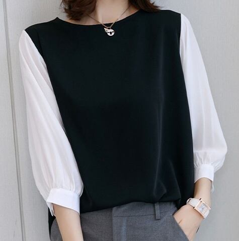 異素材ドッキングで魅せる大人可愛いモードブラウス。