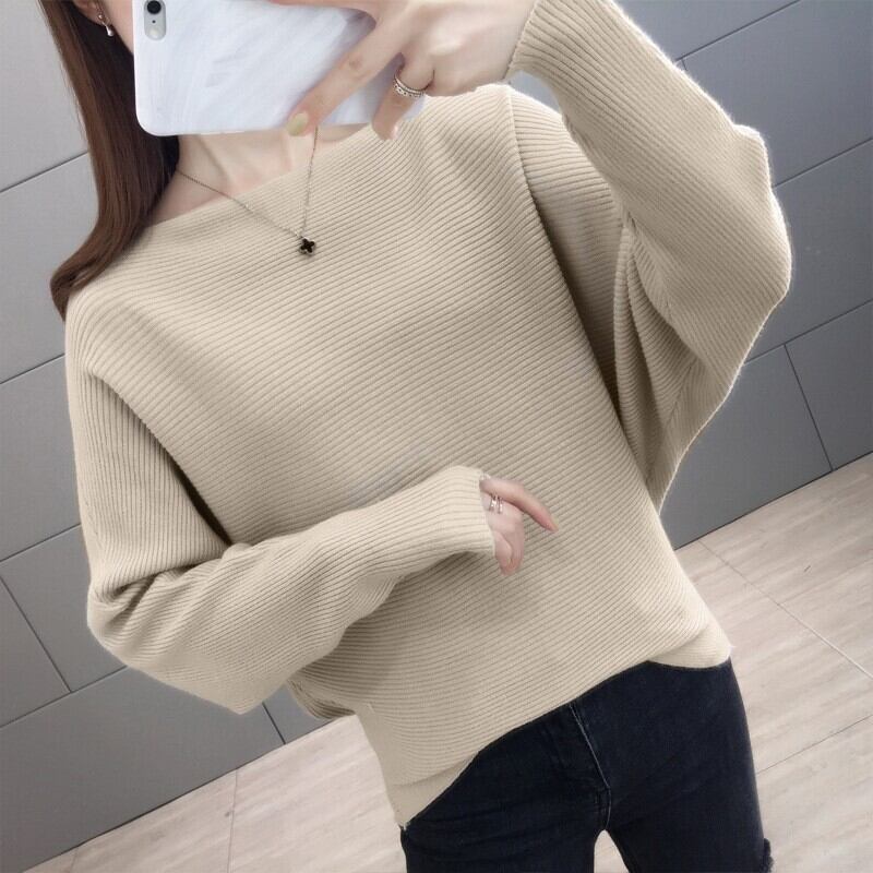 このセーターは、ボートネックデザインとドルマンスリーブが特徴の長袖ニットプルオーバーです。