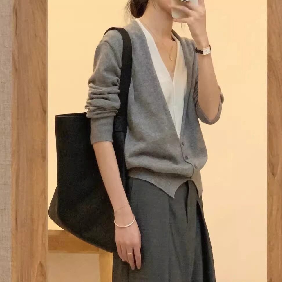 長袖のVネックに前開きのボタン仕様で、ミディアム丈が嬉しいポイントです。