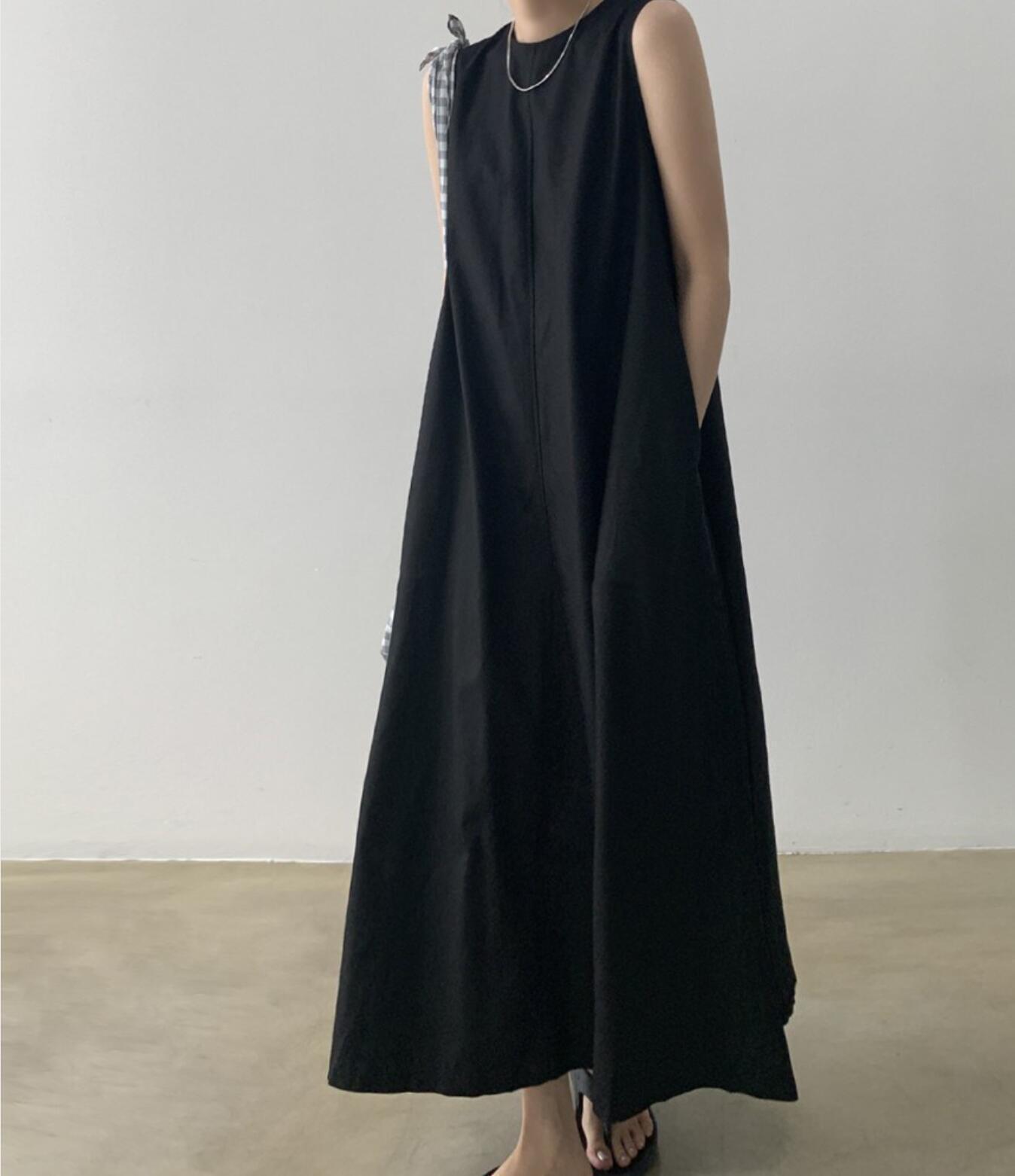 ノースリーブデザインで、ラウンドネックとフレアシルエットが特徴的。