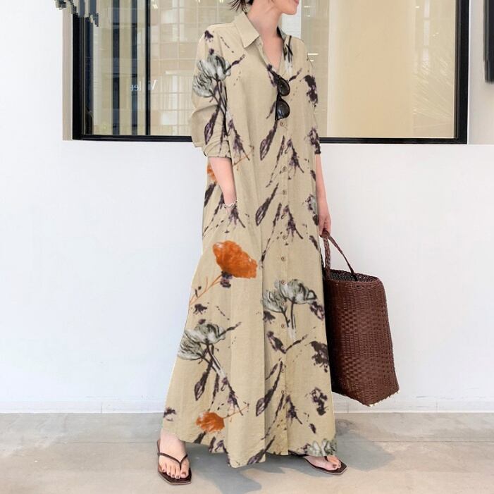 シャツワンピーススタイルで、襟付きの前開きボタンがアクセントとなり、カジュアルからきれいめなスタイルまで幅広く対応可能です。