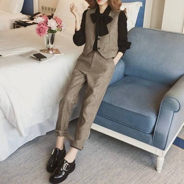 リボンタイブラウス×ベスト×テーパードパンツの3点セットで上品な大人スタイルに。