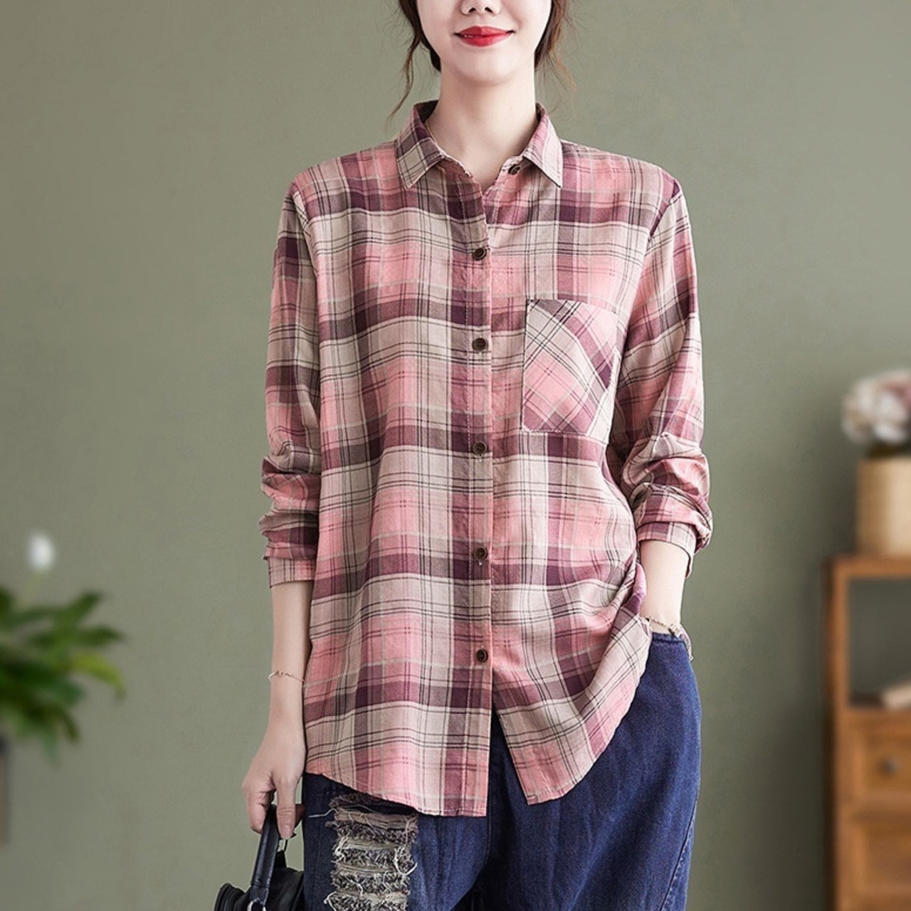 大人可愛い着こなしを実現する、ミディアム丈の長袖シャツ