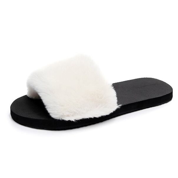 ふわふわファーがリッチな印象を演出する大人可愛いぺたんこサンダル。