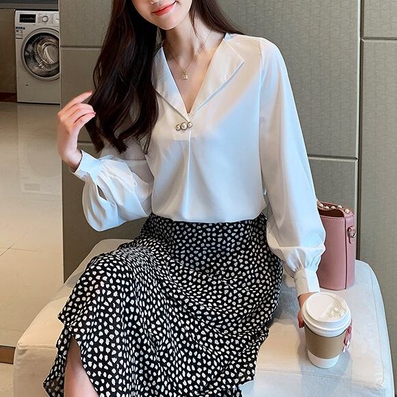 美しいVネックデザインが、女性らしさを引き立てるポイント。