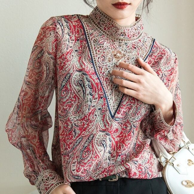 長袖、ボリューム袖で、ハイネックデザインが女性らしいシルエットを演出します。