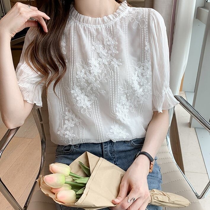 5分袖のハイネックデザインが上品で、刺繡とフリルのディテールがかわいらしさをプラスします。