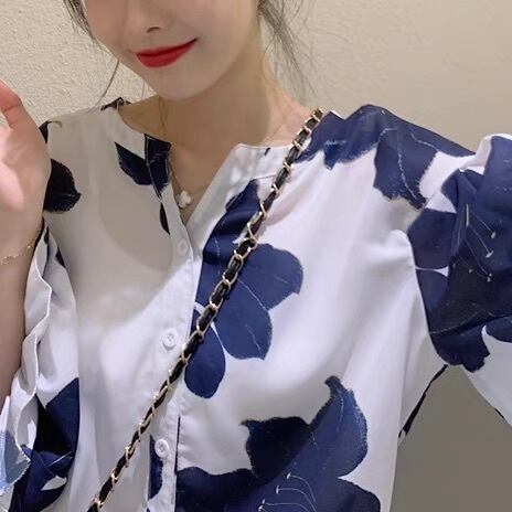 上品な花柄×前開きデザインでこなれ感のあるレイヤードコーデも楽しめる。