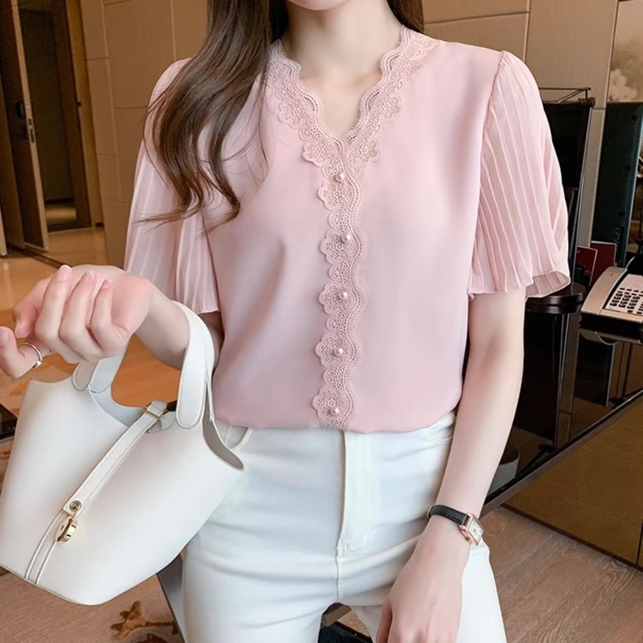 ホテルランチやデートに映える優雅なフェミニンブラウス。