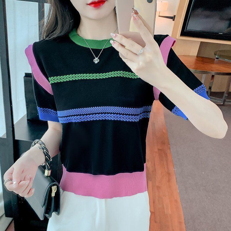 クルーネックデザインと袖フリルがフェミニンさを引き立て、春夏のコーディネートにぴったり。