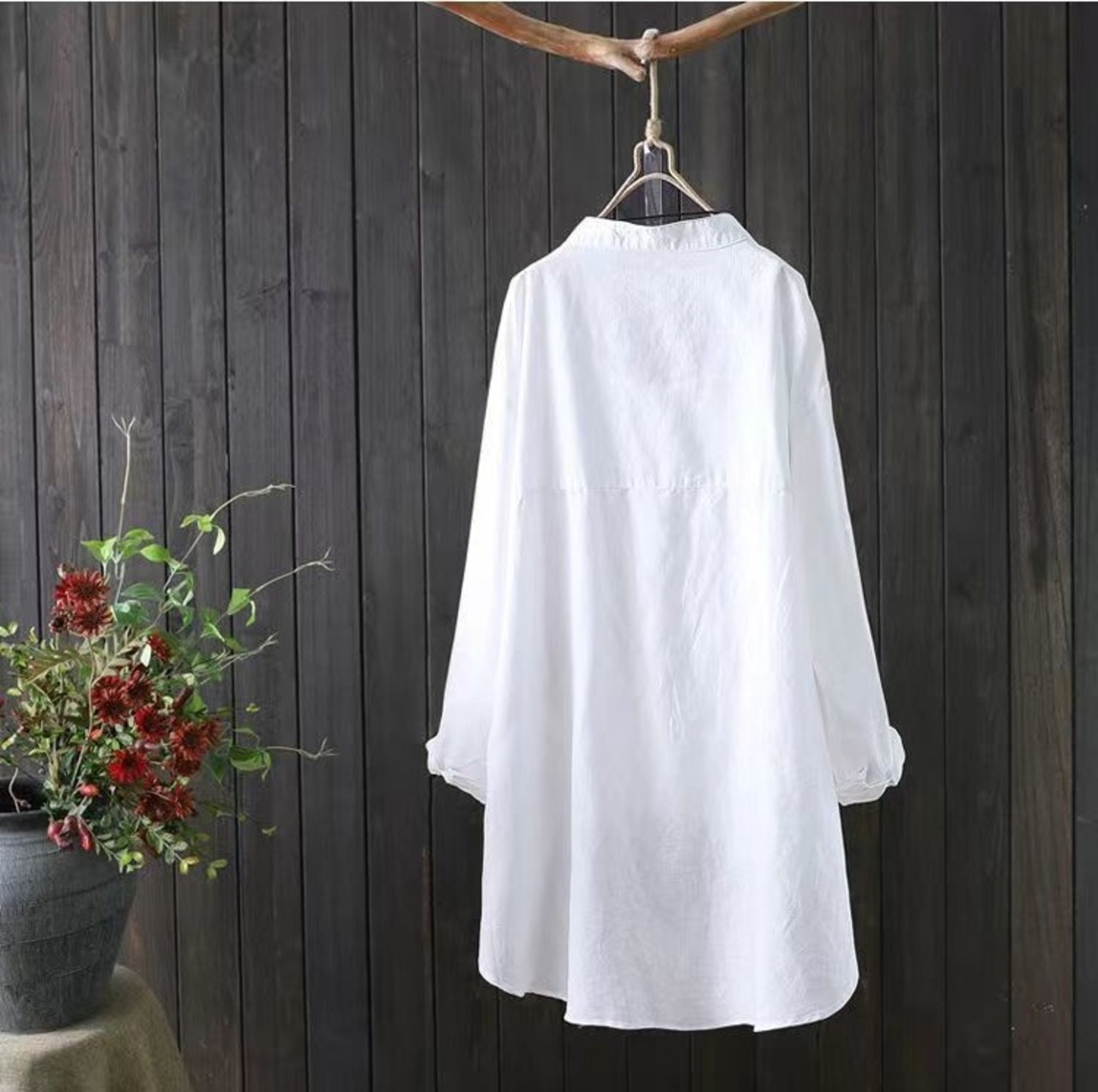 個性的なデザインとフェミニンさを兼ね備えたこのロングシャツは、前開きのノーカラー仕様とアシンメトリーなシルエットが特徴です。リネンコットン素材を使用し、薄手で軽やかな着心地を実現。日常のカジュアルスタイルはもちろん、お出かけやデートにもぴったりの一着です!さりげない配色が大人の上品さを引き立てます。オーバーサイズなので体型カバーも叶えてくれます。