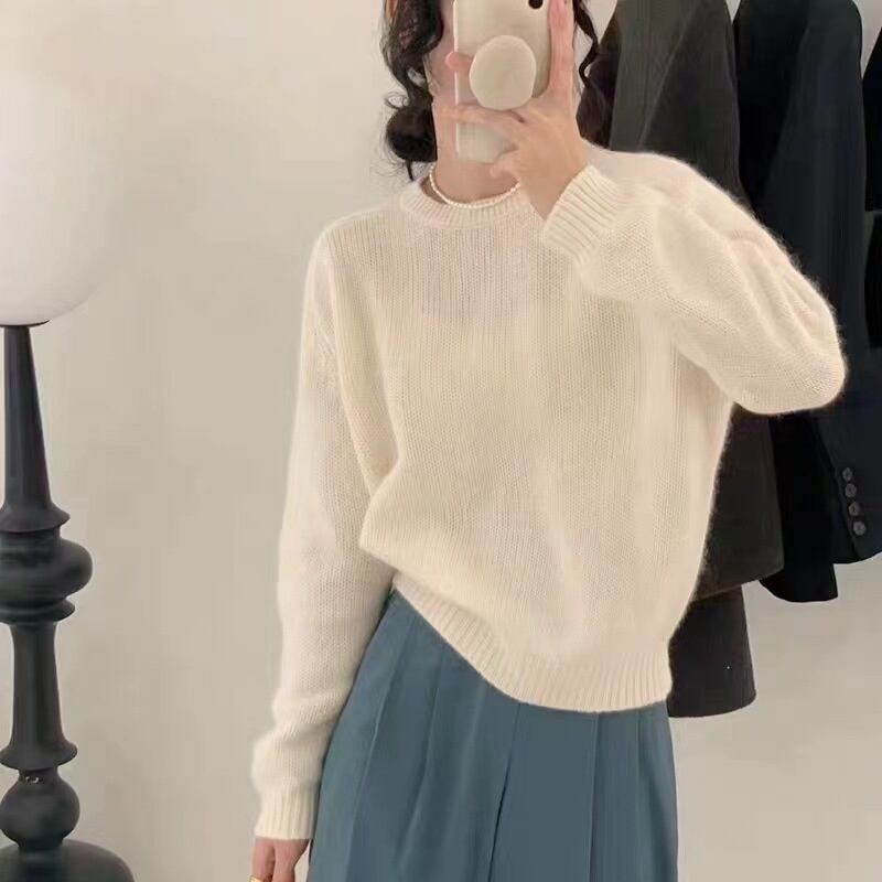 ふわふわとしたウール素材が特徴のこの長袖セーターは、シンプルながらも上品な雰囲気を演出します。