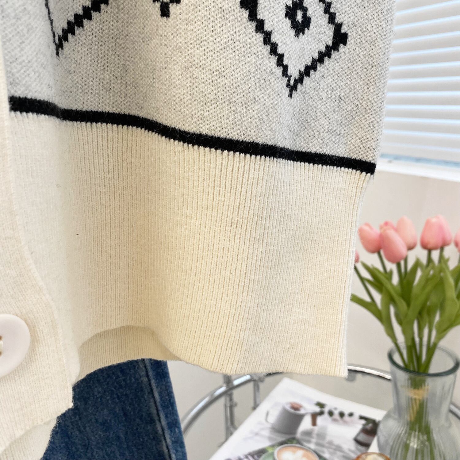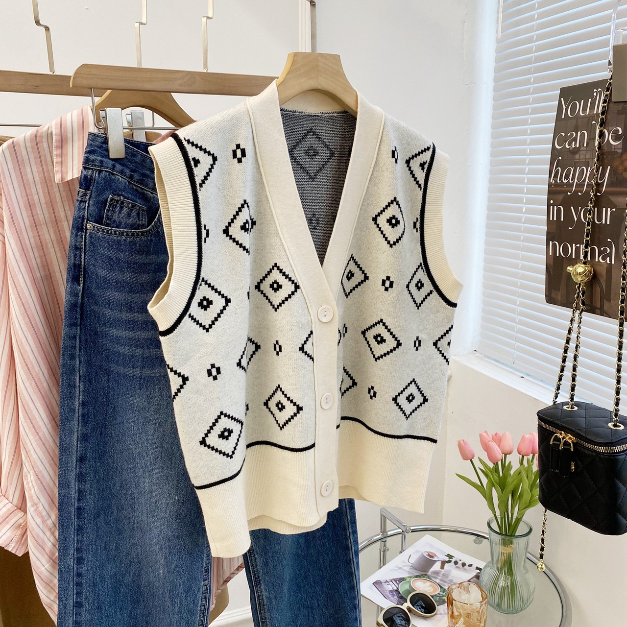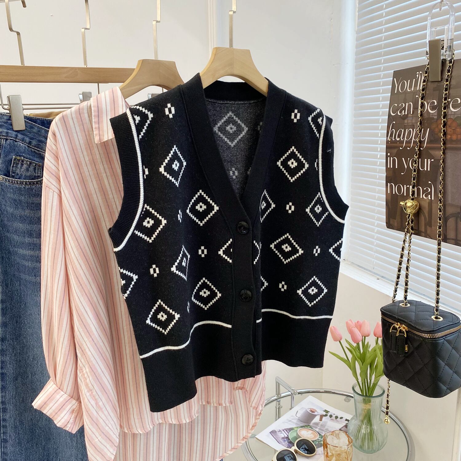 幾何学模様が映えるヴィンテージ感たっぷりのベストで視線をひとりじめ。