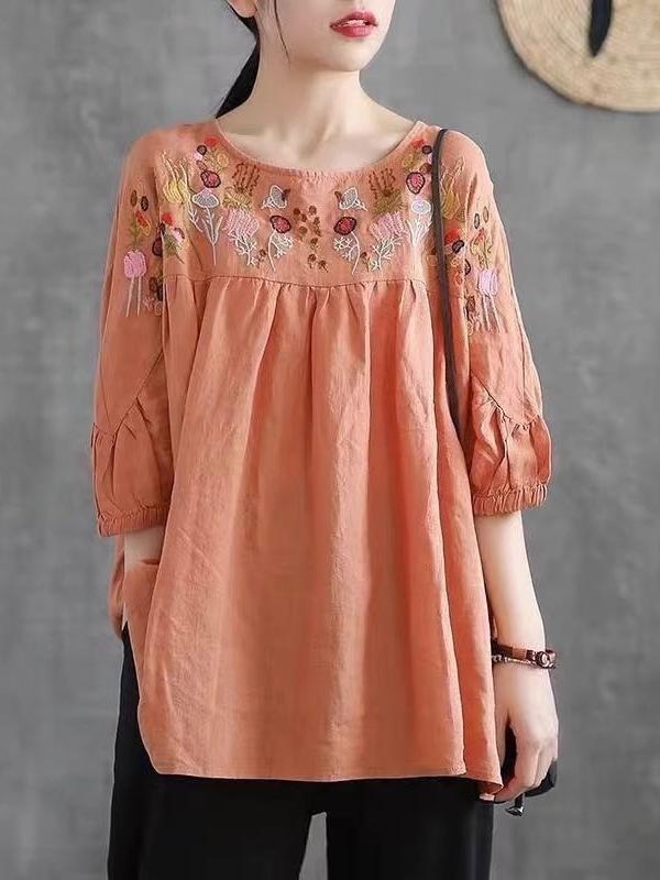 ラウンドネックのデザインと可愛い刺繡が施されたミディアム丈は、大人可愛い雰囲気を演出します。