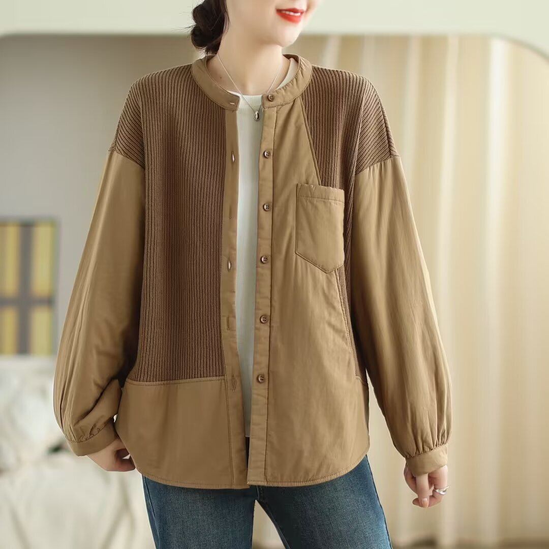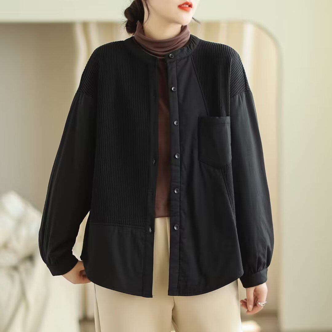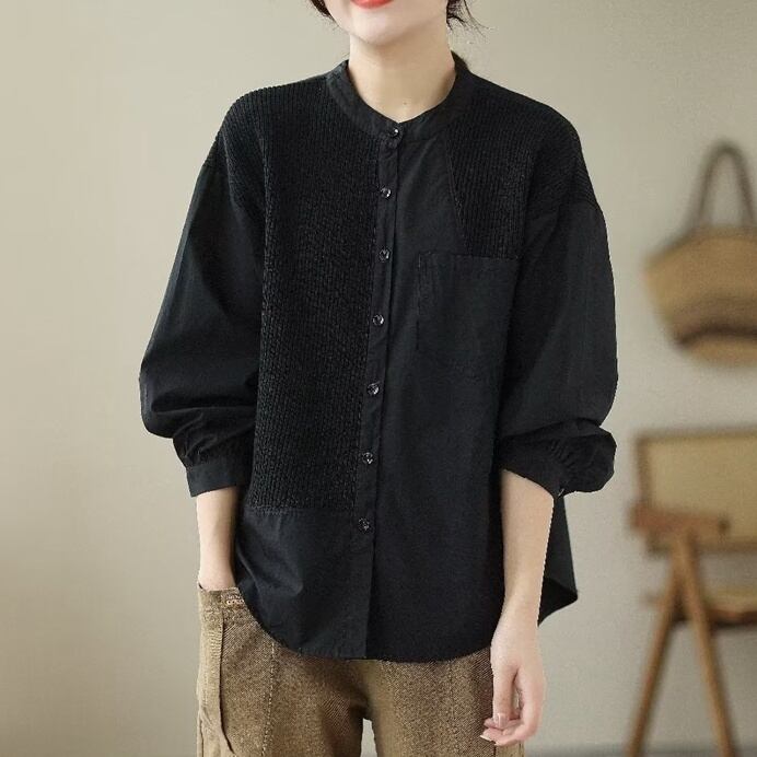 異素材ミックスが特徴的で、前開きボタン仕様のこのシャツは、カジュアルなシーンから上品なオフィススタイルまで幅広く活躍します。
