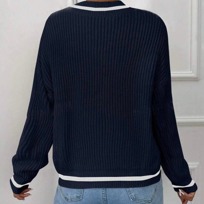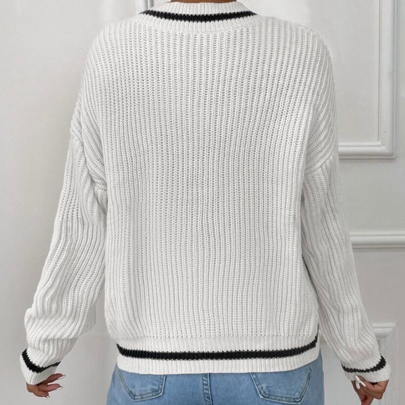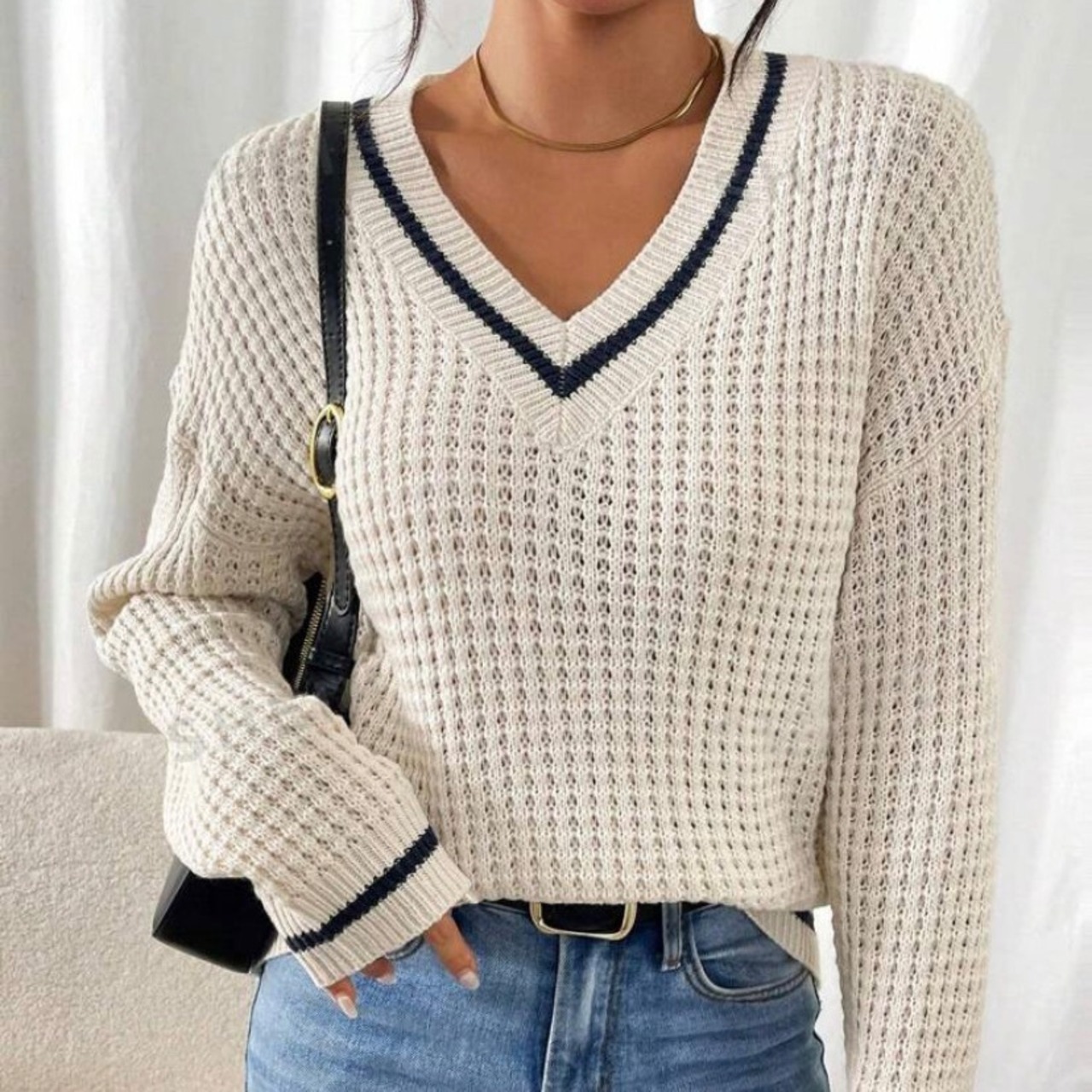バイカラーの配色が映えるVネックのニットプルオーバー。