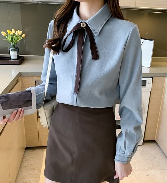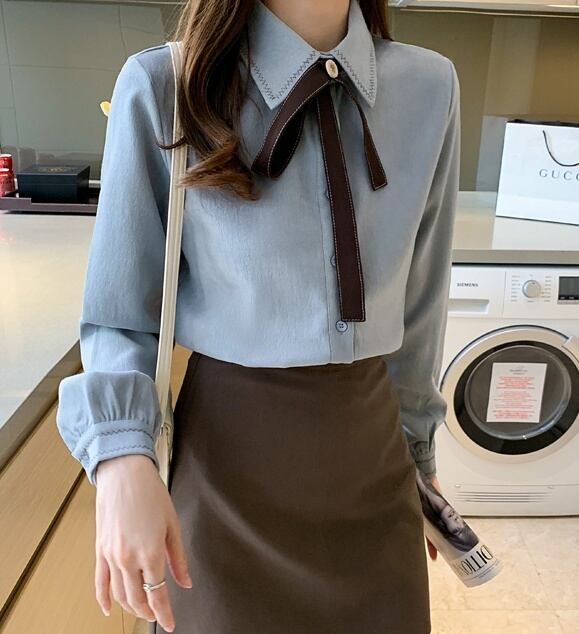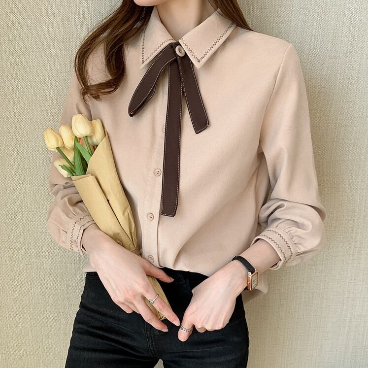 襟付きで上品な印象を与え、前開きボタンとリボンがアクセントになっています。