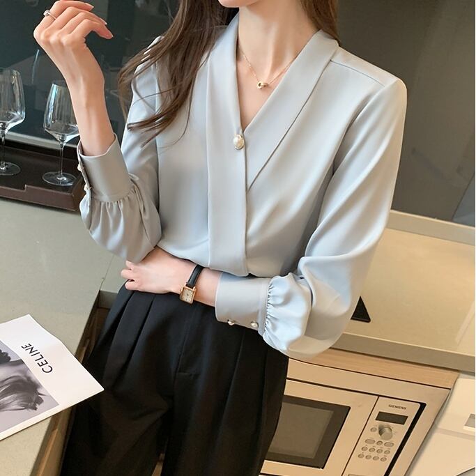 シフォン素材の長袖Vネックシャツは、ミディアム丈でビジュー付きの上品なデザインです。