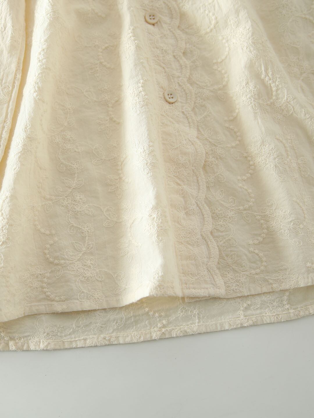 この長袖ブラウスは、上品な刺繡とレースのデザインが特徴で、シンプルながらも存在感を放つ一着です。