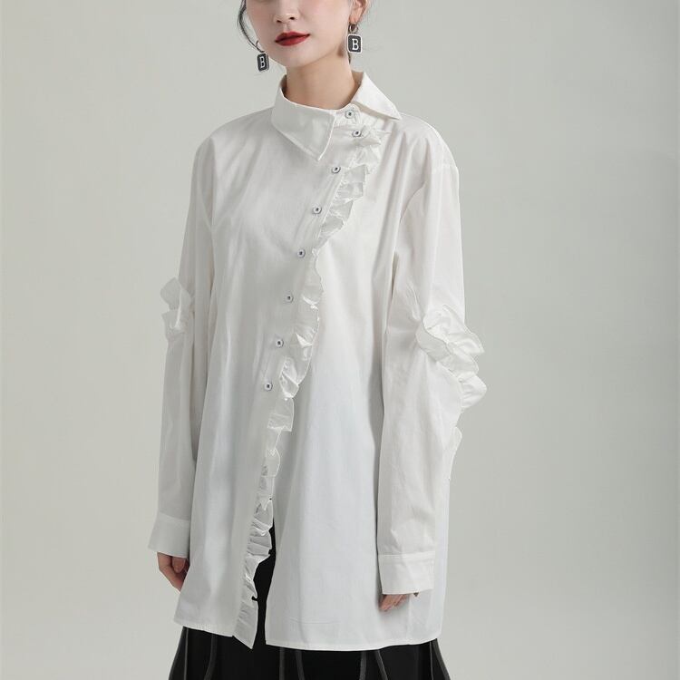 このトップスは、長袖の襟付きデザインに加え、前開きのボタンとフリルで可愛らしさを演出。