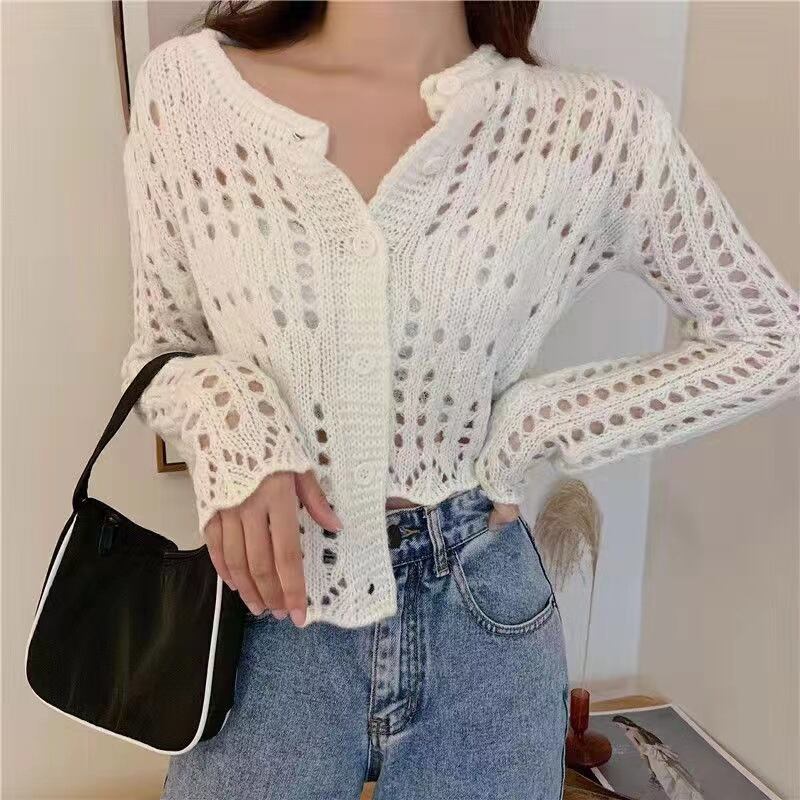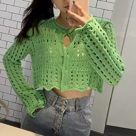 透かし編みが施された長袖のラウンドネックデザインは、シンプルながらも上品でおしゃれな雰囲気を引き立てます。