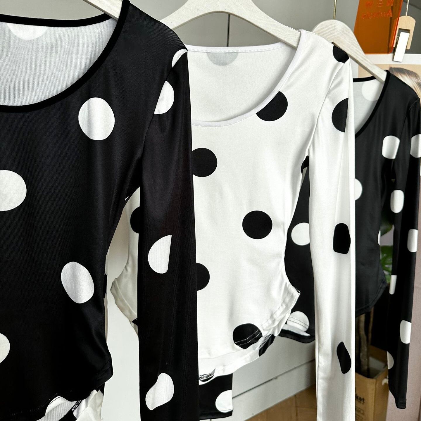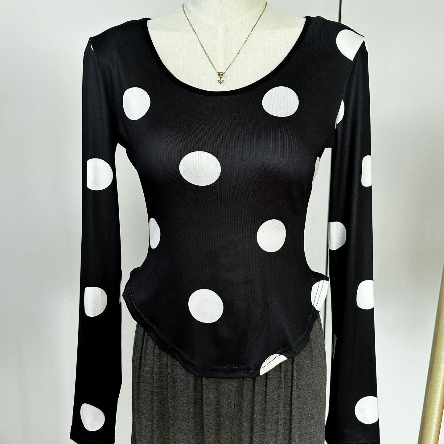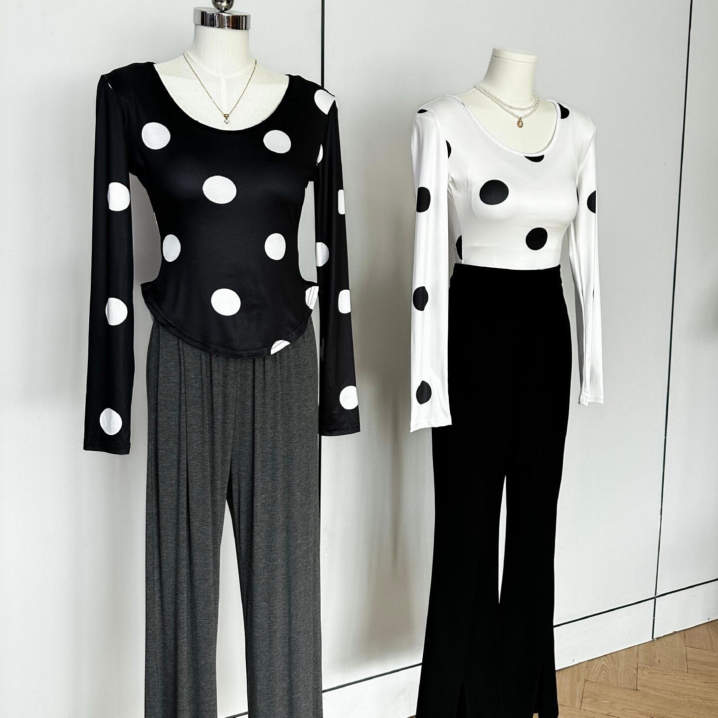 ドット柄が甘さを引き立てる細見えタイトな美シルエット。