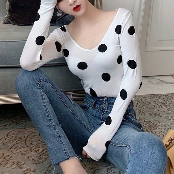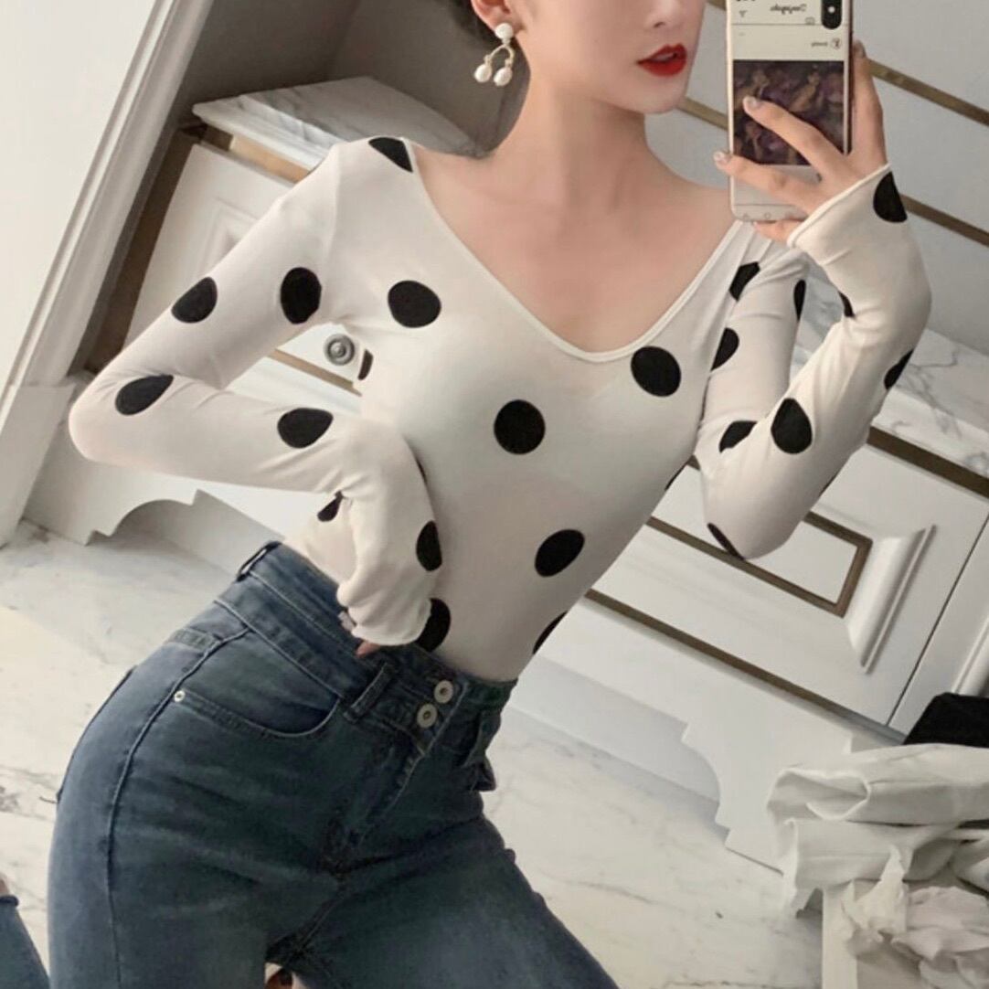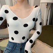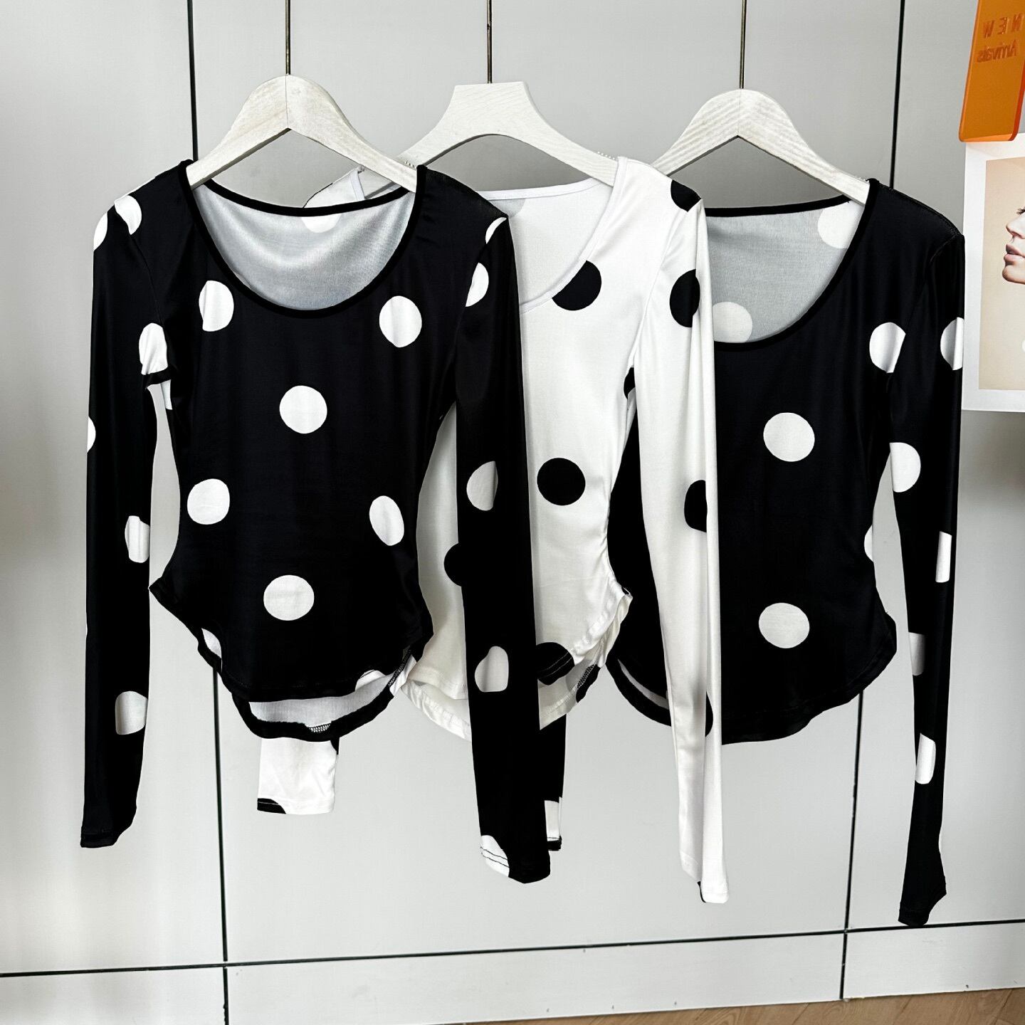 ドット柄が甘さを引き立てる細見えタイトな美シルエット。