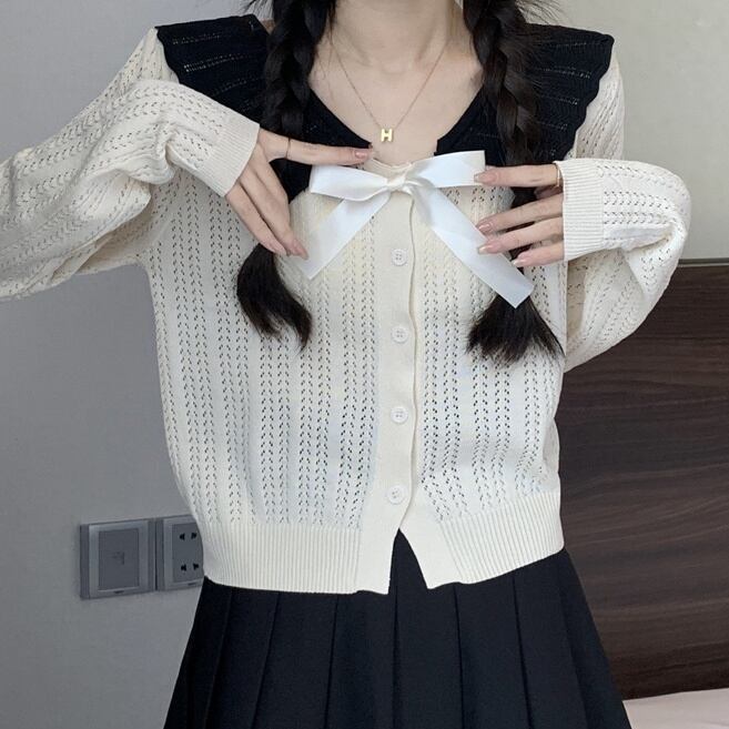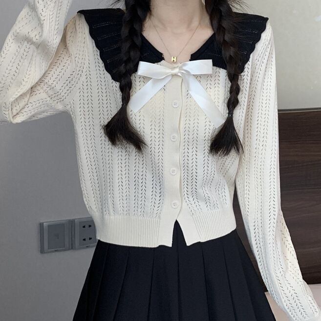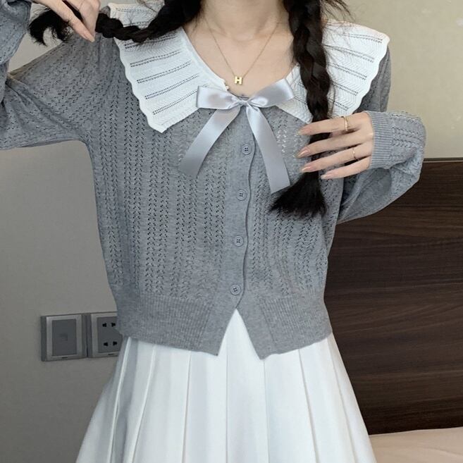 この長袖カーディガンは、ビックカラーと前開きのボタンデザインが特徴です