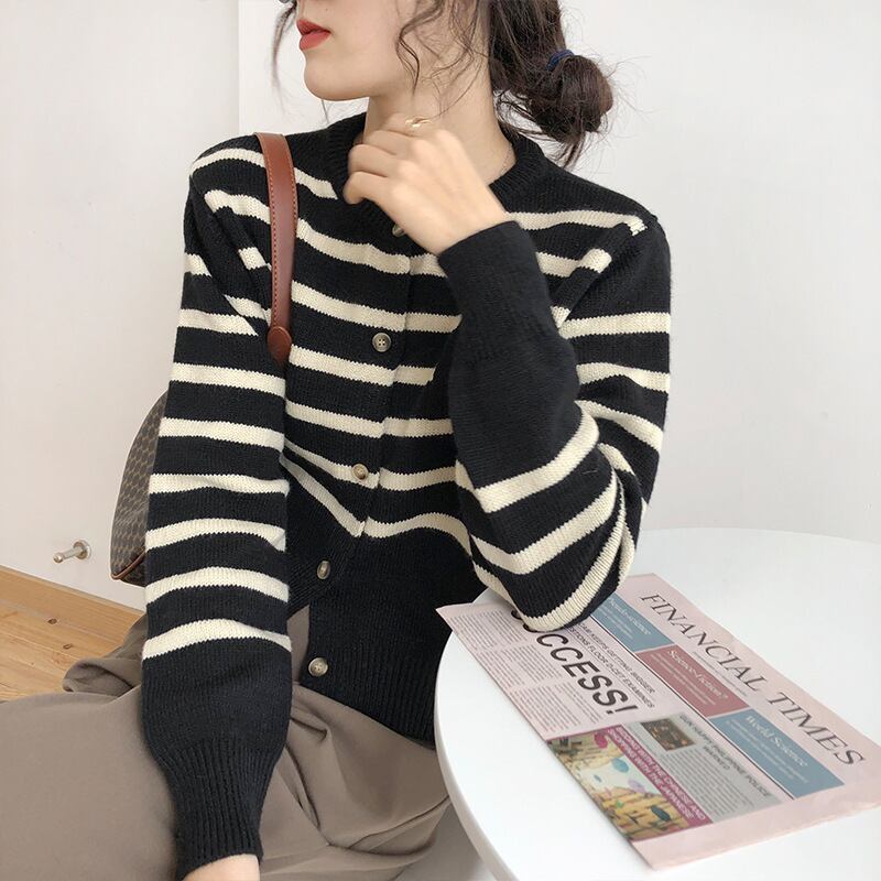 長袖・ラウンドネックのデザインで、前開きボタン仕様が特徴です。