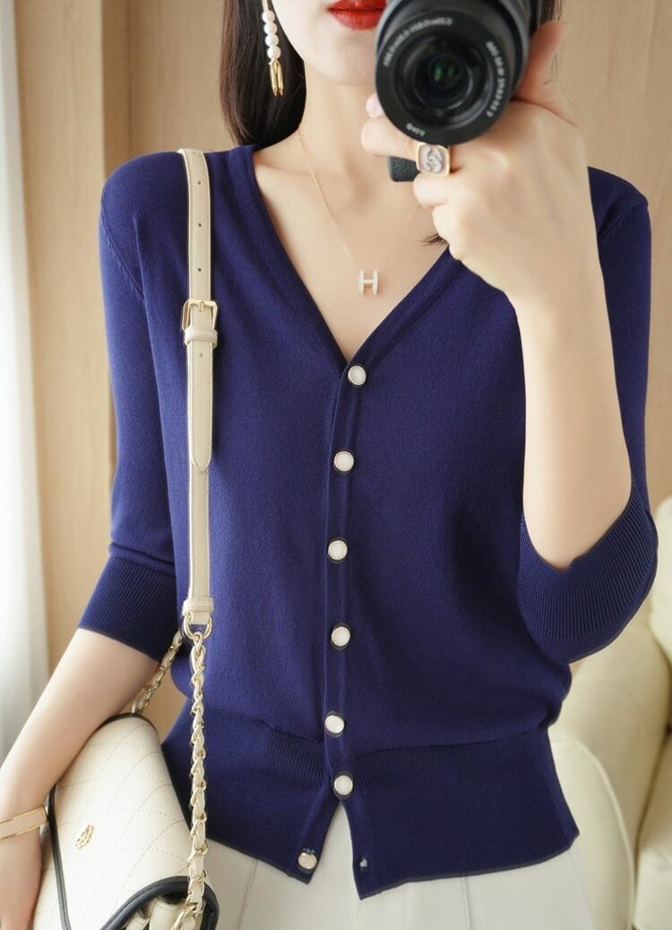 前開きデザインで、着脱も楽々。長袖の羽織りとして、春夏秋のちょっと肌寒い時期のコーディネートにぴったりです。Vネックのデザインとスリムなシルエットが、女性らしいフェミニンさを引き立てます。ボタン付きで、カジュアルからきれいめまで幅広く活躍してくれるアイテムです。