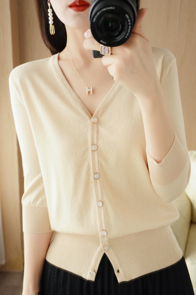 シンプルでありながらおしゃれな印象を与える、薄手のニットカーディガンの登場です!