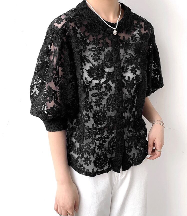 軽やかな透け感のある素材を使用した、ボリューム袖が特徴の前開きブラウスです。ラウンドネックで襟なしのデザインは、シンプルながらもフェミニンな印象を与え、どんなスタイルにもマッチします。