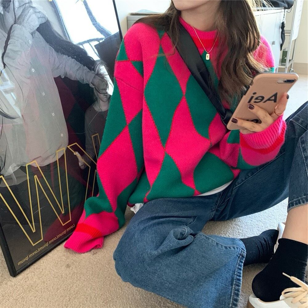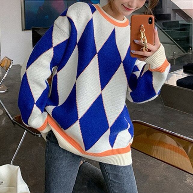 派手可愛い、コントラストカラーがオシャレなニットトップス。