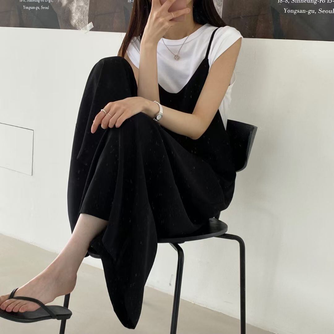 ワイドパンツとサロペットをミックスさせたこのアイテムは、シンプルでありながら存在感抜群。