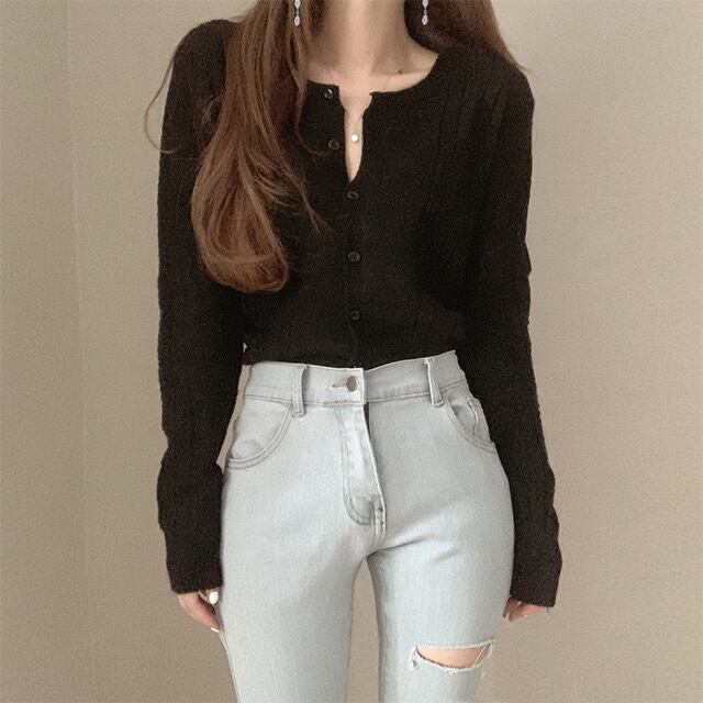 きれいめカジュアルスタイルにオススメな透かしニットカーディガン。