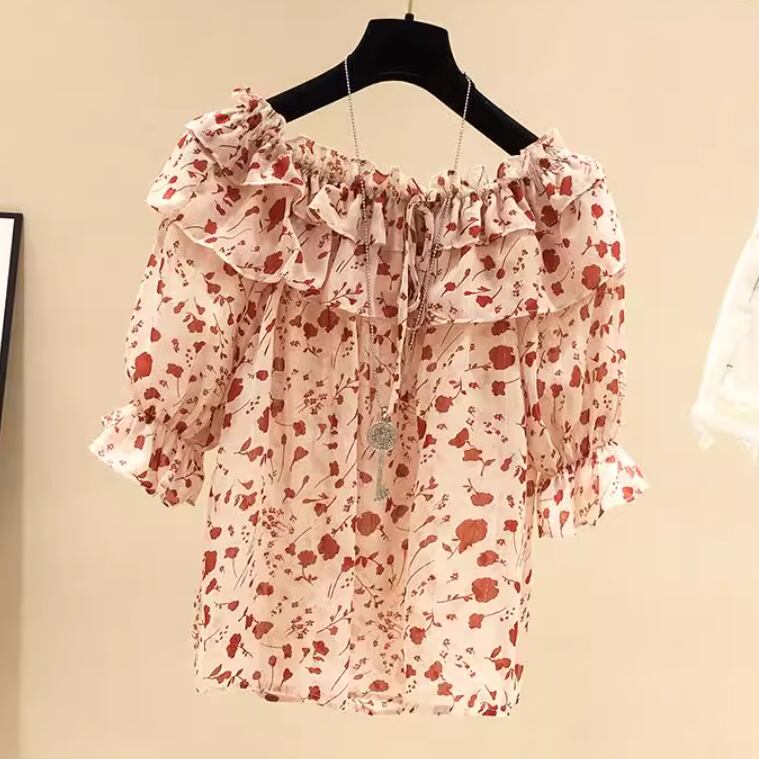 花柄とフリルがエレガントでフェミニンな半袖シフォンシャツ