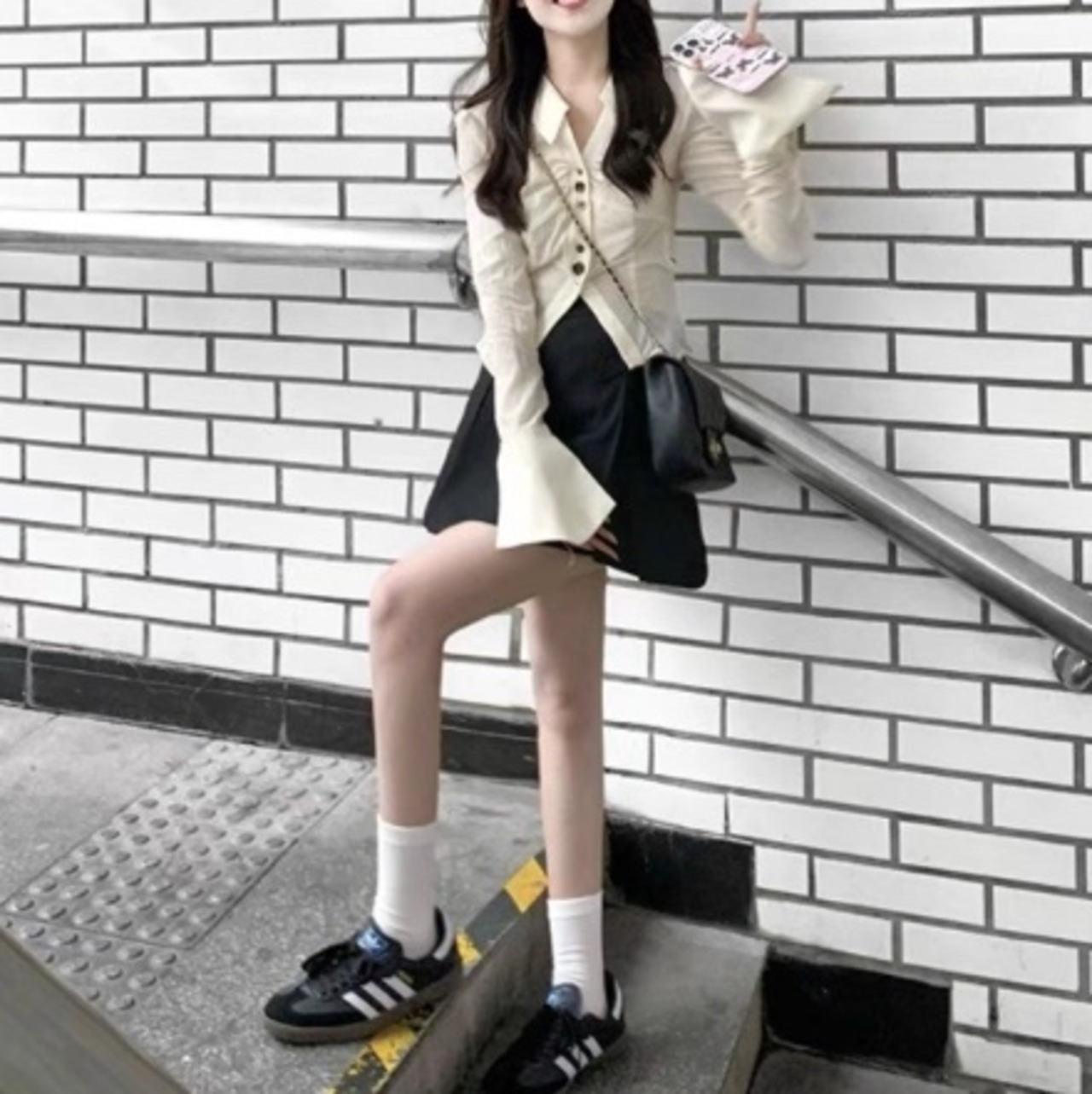 女っぽさを引き立てる華奢見えシルエットとベルスリーブの美バランス。