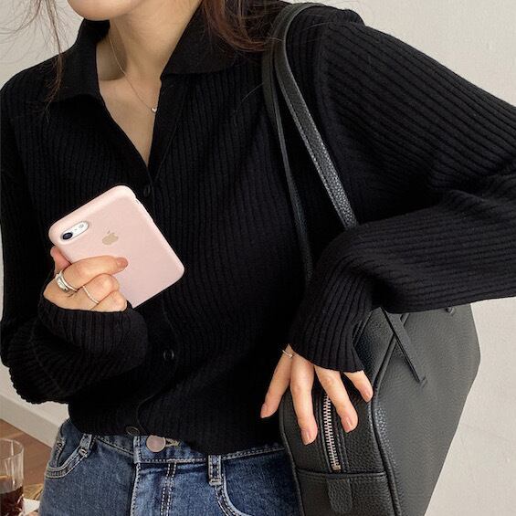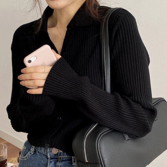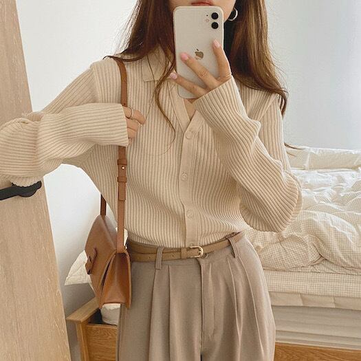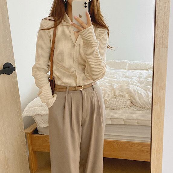 大人ナチュラルカジュアルなスタイルにオススメ!ポロカラー×リブニットカーディガン。