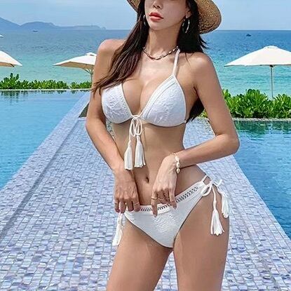 レース×リボンで魅せる儚くも大胆な三角ビキニ。