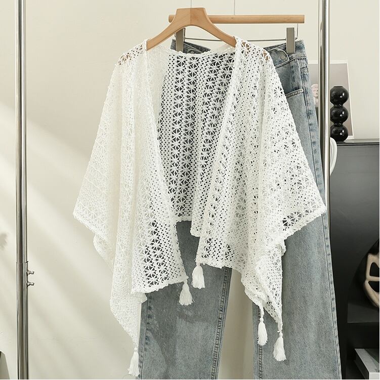 透かし編みのデザインがフェミニンで、こなれ感を演出します。また、前開きのポンチョ風スタイルで気軽に羽織れる一着です。