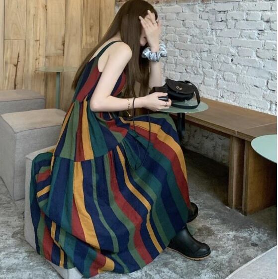 夏の光を纏うカラフルストライプのキャミワンピ。