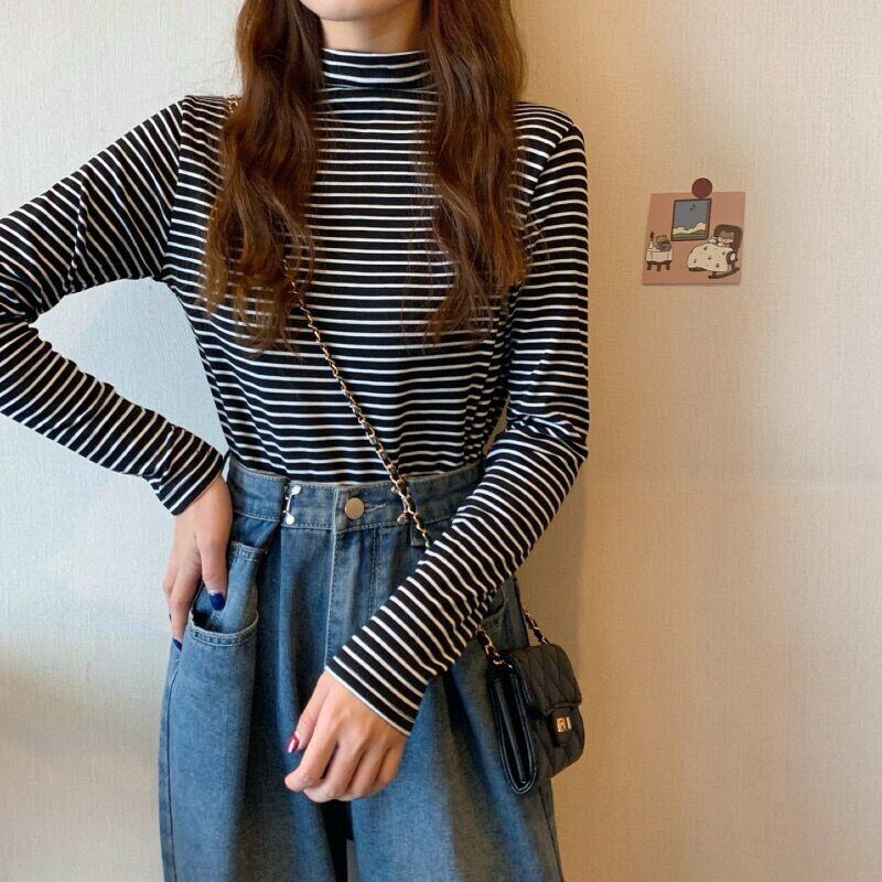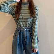 ハーフタートルネック×ストライプ柄がこなれたカジュアルな雰囲気を演出してくれます。