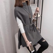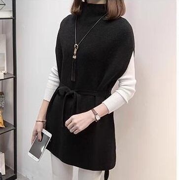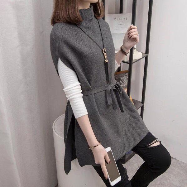ウエストリボンでフェミニンさを引き立てるノースリーブニット。