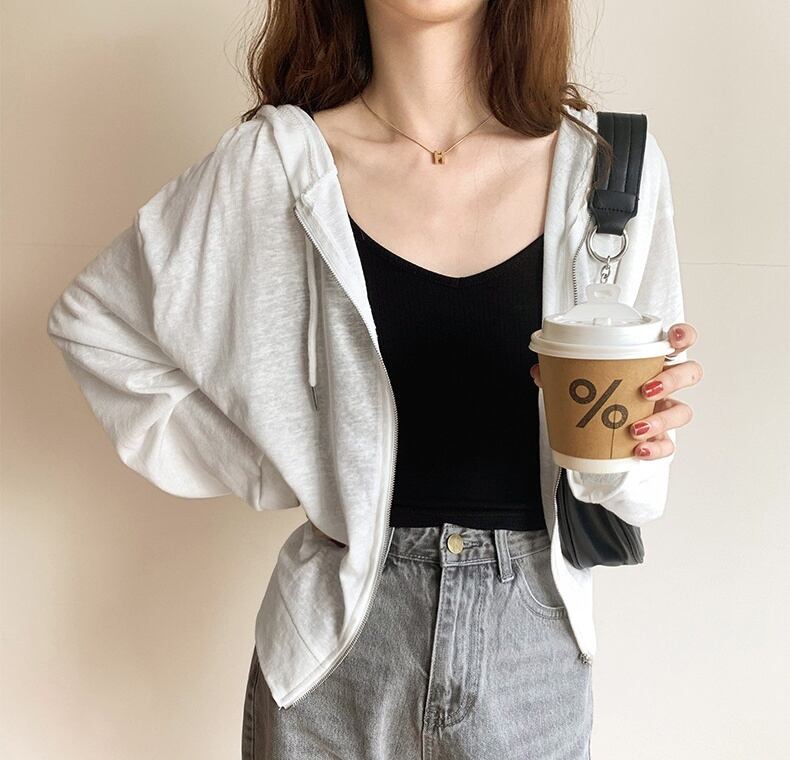 秋から春にかけて活躍する長袖の前開きミディアム丈で、ファスナー付きの薄手の素材が特徴です。