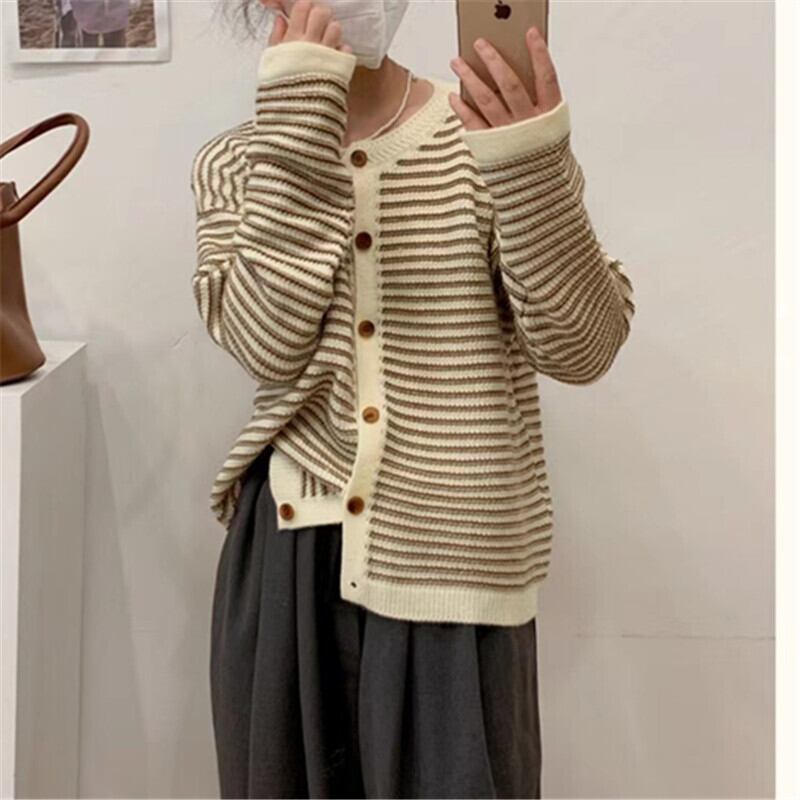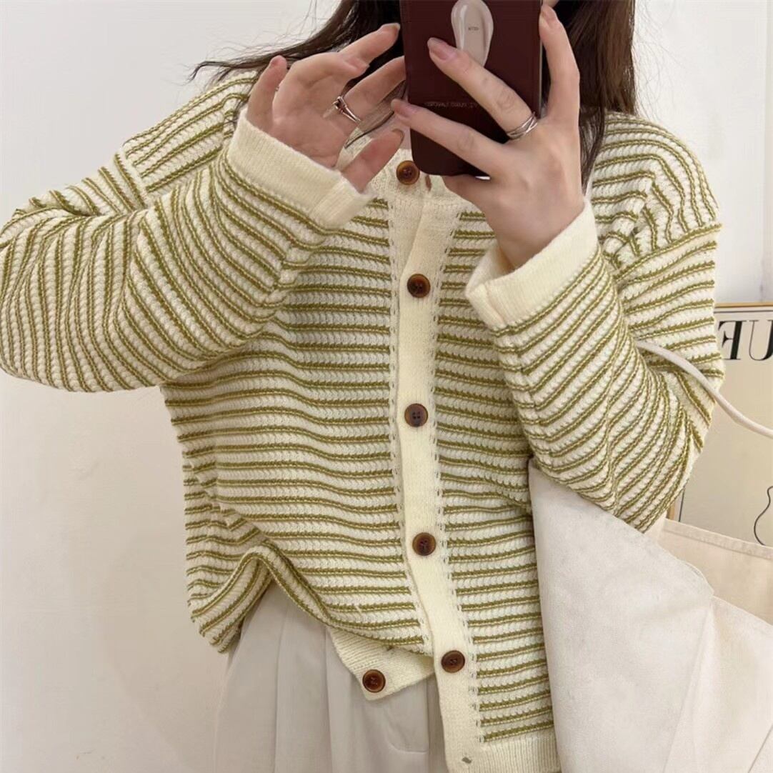 こちらの長袖ニットカーディガンは、ラウンドネックデザインでカジュアルにもきれいめにもコーディネート可能です。