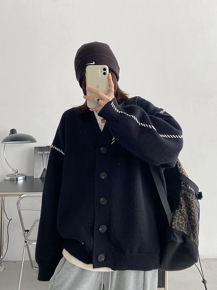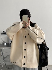 長袖のVネックデザインで、ミディアム丈の前開きタイプ。