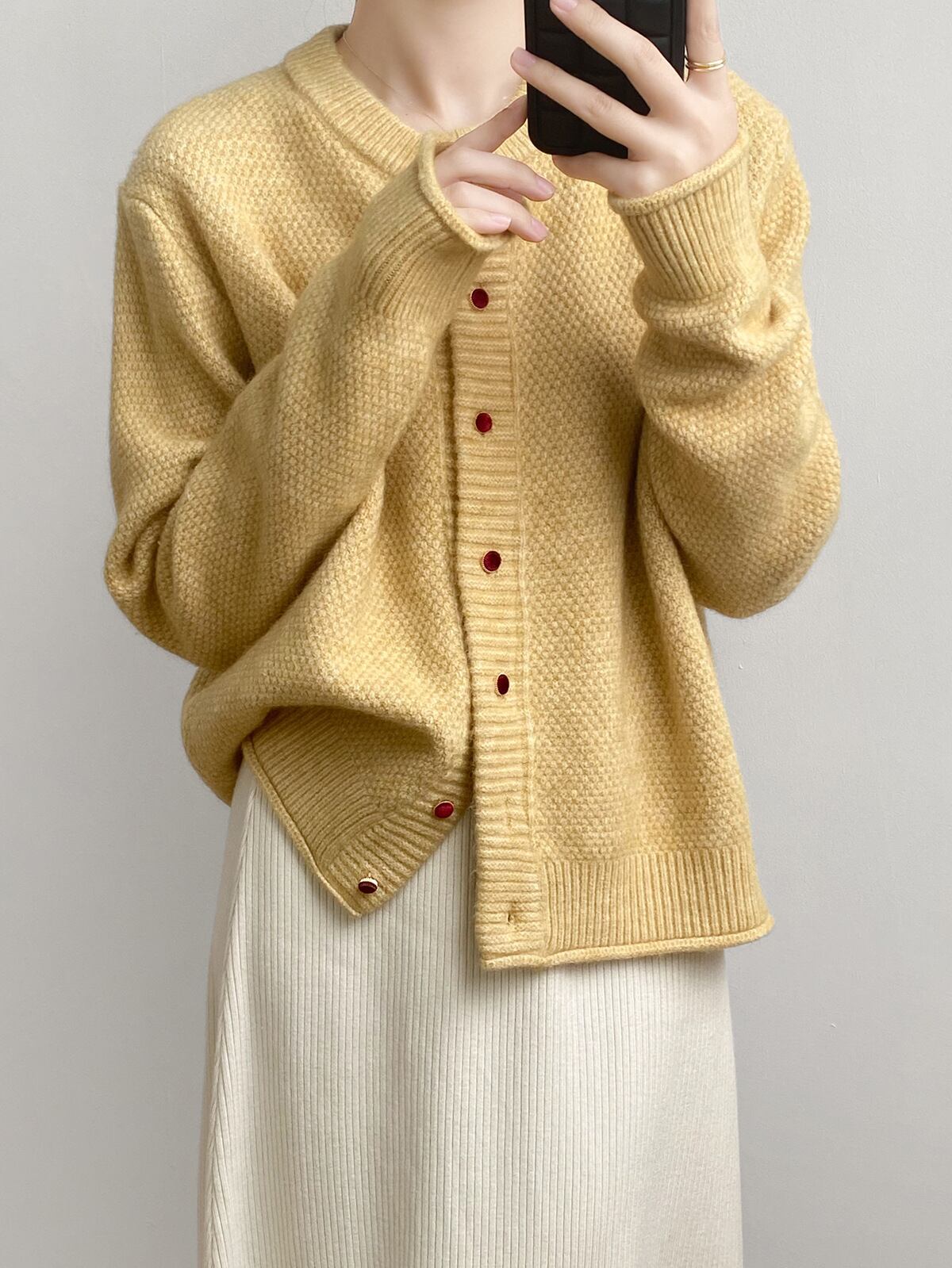 ラウンドネックと前開きのデザインが、シンプルながら上品な印象を与えます。